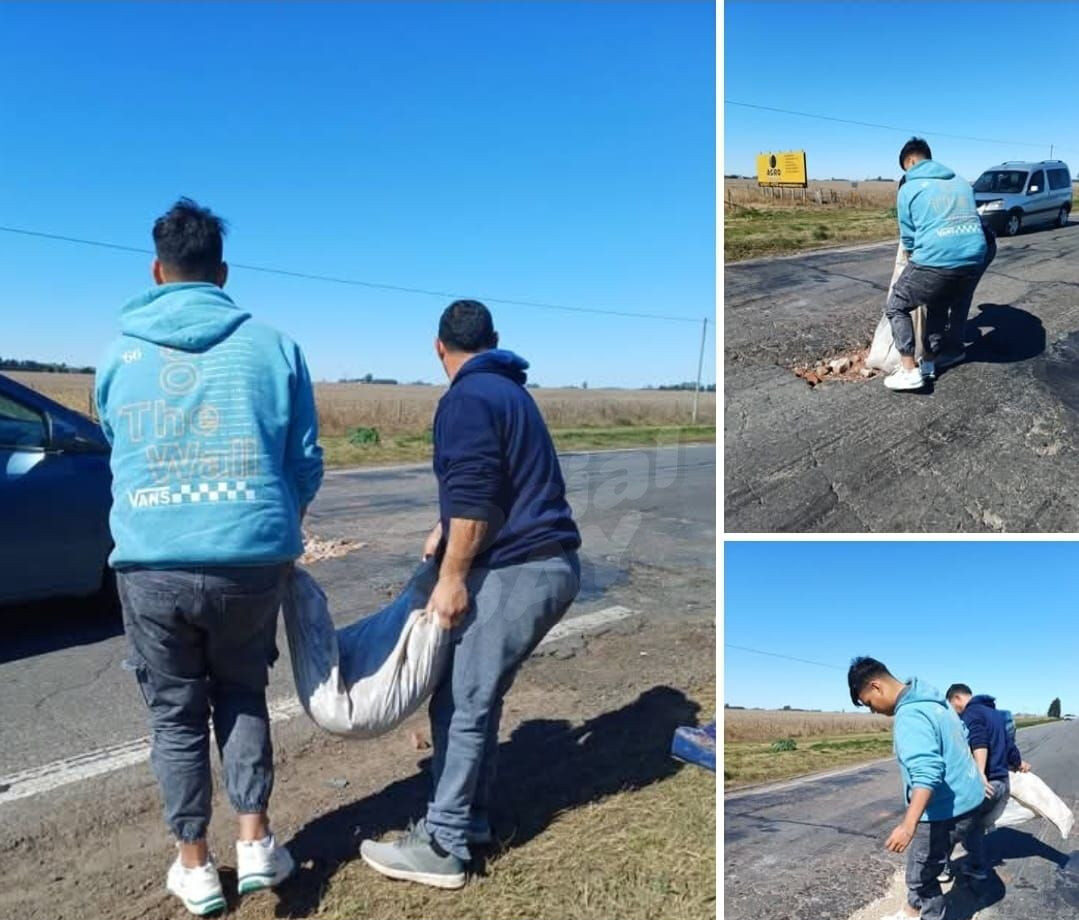 Frente a la inacción estatal, dos vecinos de Las Parejas, Kevin y Juan, decidieron intervenir por cuenta propia y rellenar el bache con escombros y material, improvisando una solución provisoria para evitar nuevos incidentes.