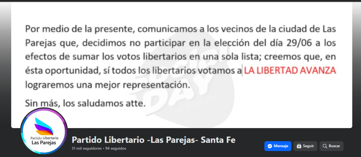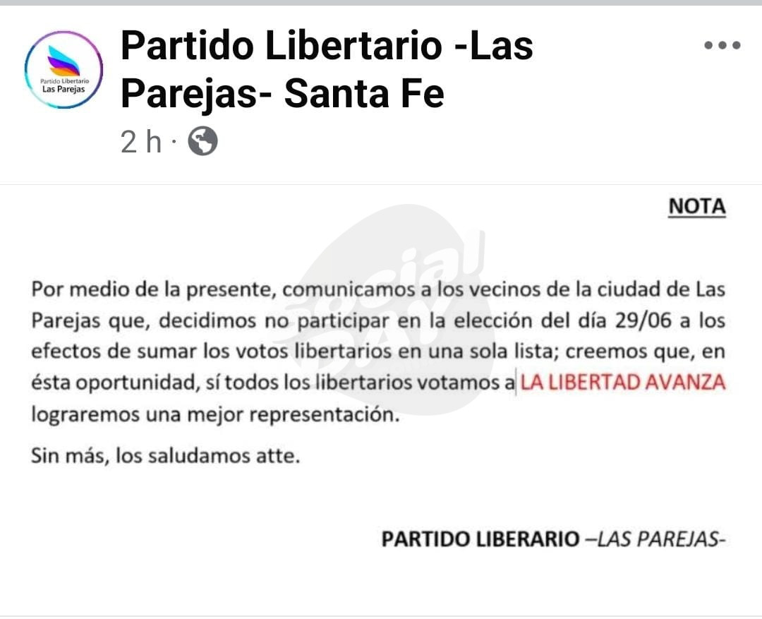 Mediante un comunicado por redes sociales, la Lista del Partido Libertario Las Parejas encabezada por Héctor David Baldo, anunció que no participará de las elecciones del día 29 de Junio.